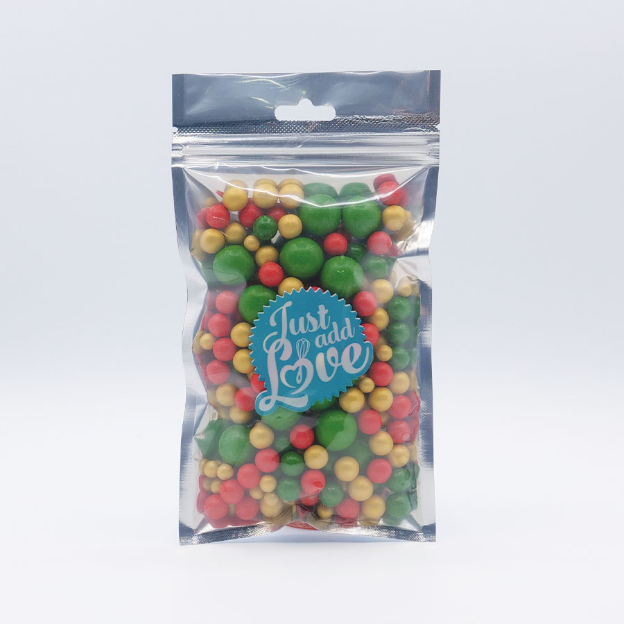 Une combinaison de sphères croquantes et de perles de chocolat aux couleurs de Noël les plus classiques. Vos desserts seront plus jolis et encore plus savoureux.
