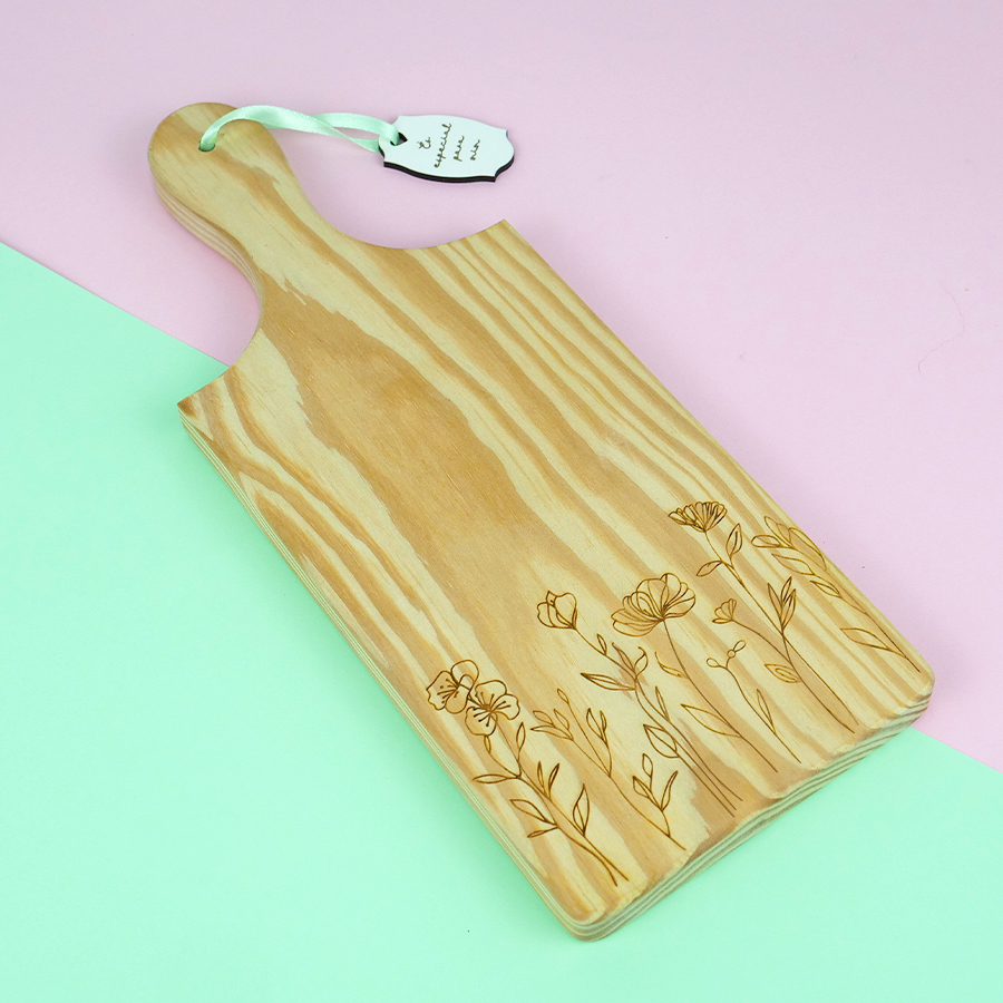 Natural wooden kitchen board, decorated with delicate flower designs that bring a touch of charm and lightness to your kitchen. Ideal for both food preparation and serving at the table, it combines functionality with a cozy and timeless design. Made with quality materials, it is durable and practical for daily use, also making an excellent gift option. An accessory that transforms simple moments into special experiences, where every detail blossoms with flavor and care. Contains a tag with the message "És especial para mim". Package includes 1 unit. Material: Wood and White MDF