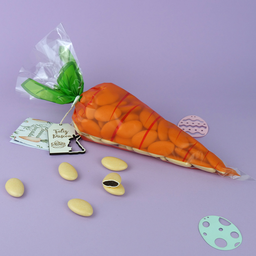 Um presente doce e elegante para celebrar a Páscoa. Uma cenoura recheado com deliciosas amêndoas de chocolate, uma tradição irresistível desta época especial. Perfeito para oferecer a familiares, amigos, professores, colegas, madrinha, padrinho, é uma lembrança delicada e cheia de significado. Uma sugestão encantadora para tornar a Páscoa ainda mais doce. Contém cerca de 250 gr de amêndoas de chocolate.