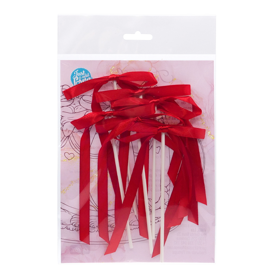 Topper avec de délicats nœuds en satin, idéal pour décorer gâteaux, cupcakes et desserts avec une touche élégante et romantique. Parfait pour suivre la tendance des gâteaux vintage, en ajoutant de la couleur et de l’élégance à vos créations. Dimensions approximatives: 9 x 18 cm Emballage avec 6 unités.