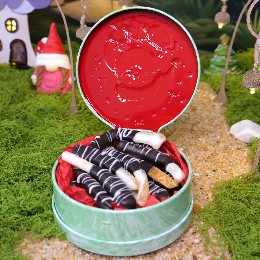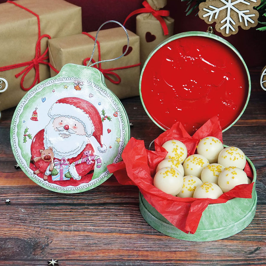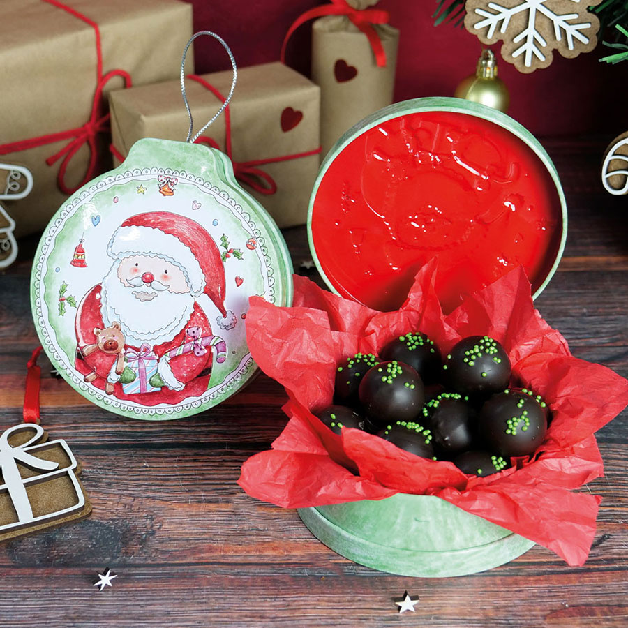 Latinha com decoração em relevo. Fica linda a decorar a sua árvore de Natal. Pode enche-la com brigadeiros, trufas, bombons, gomas, tiras de laranja com chocolate. Um excelente prenda deliciosa.