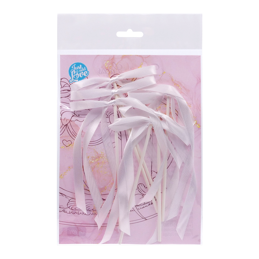 Topper com laços de cetim delicados, ideal para decorar bolos, cupcakes e sobremesas com um toque elegante e romântico. Perfeito para acompanhar a tendência dos bolos vintage, acrescentando cor e elegância às tuas criações. Medida aproximada: 9 x 18 cm Embalagem com 6 unidades.